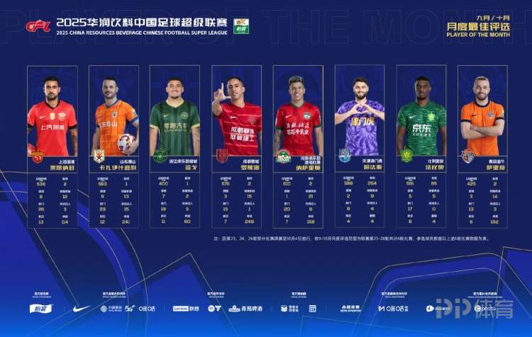 注:因第23、24、26轮部分比赛调赛至10月4日进行,故9/10月月度评选范围为联赛第23-28轮共计6轮比赛,参选球员数据以上述6轮比赛数据为准。