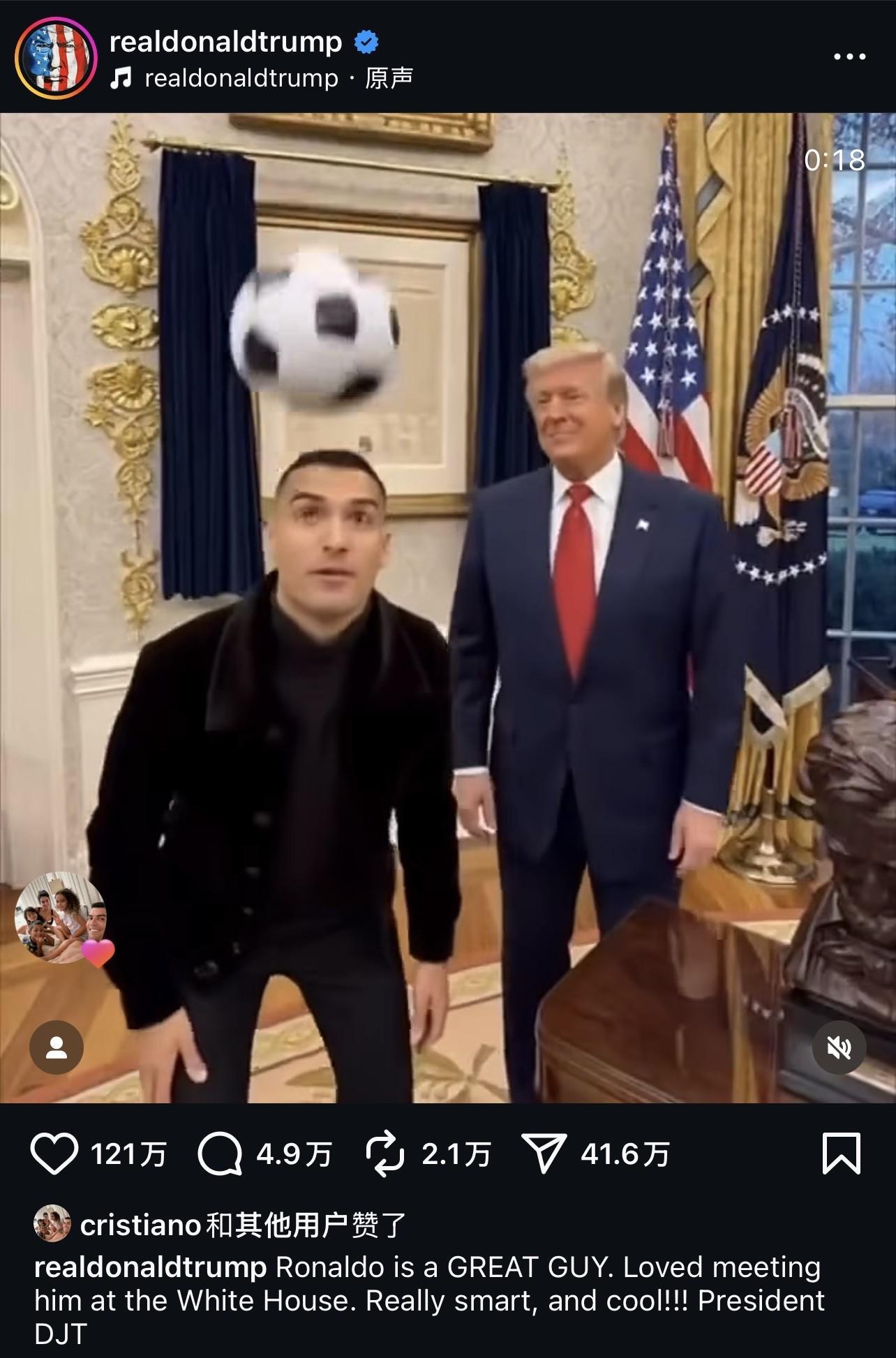 美国总统特朗普在社媒放出一段与C罗踢球的AI生成视频,并配文:“C罗是个很棒的人,我非常喜欢在白宫与他见面。他真的很聪明也很酷!!!——特朗普总统。”