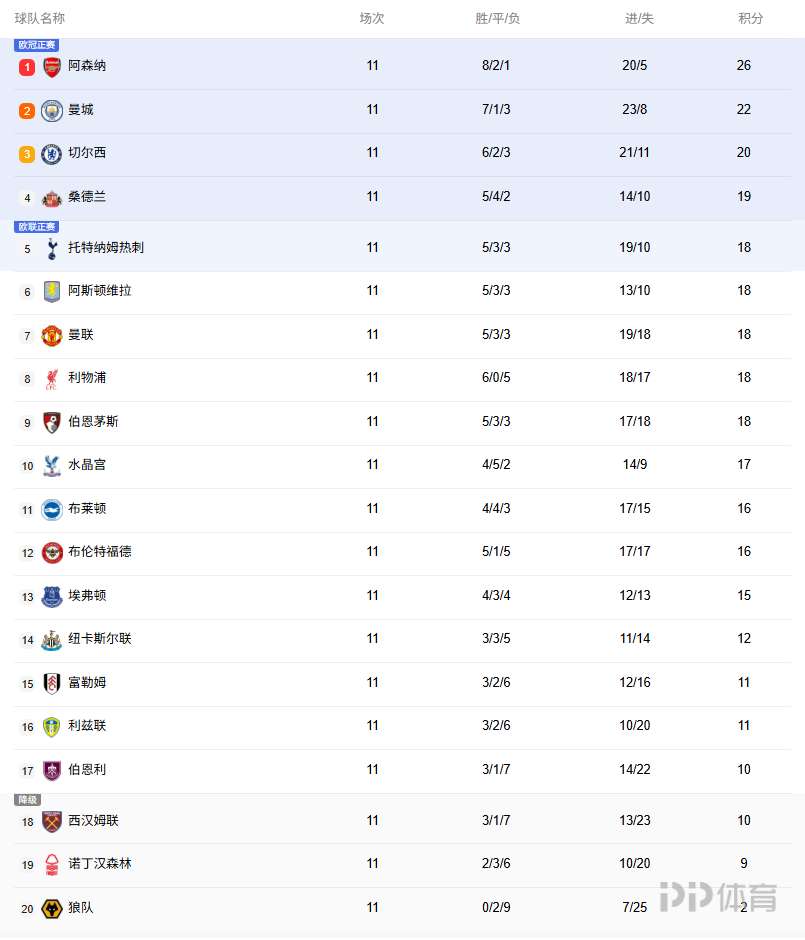 本轮英超,曼城大胜利物浦,积分榜最新情况如图。目前阿森纳26分领跑,曼城22分第2,切尔西20分第3,桑德兰19分第4。