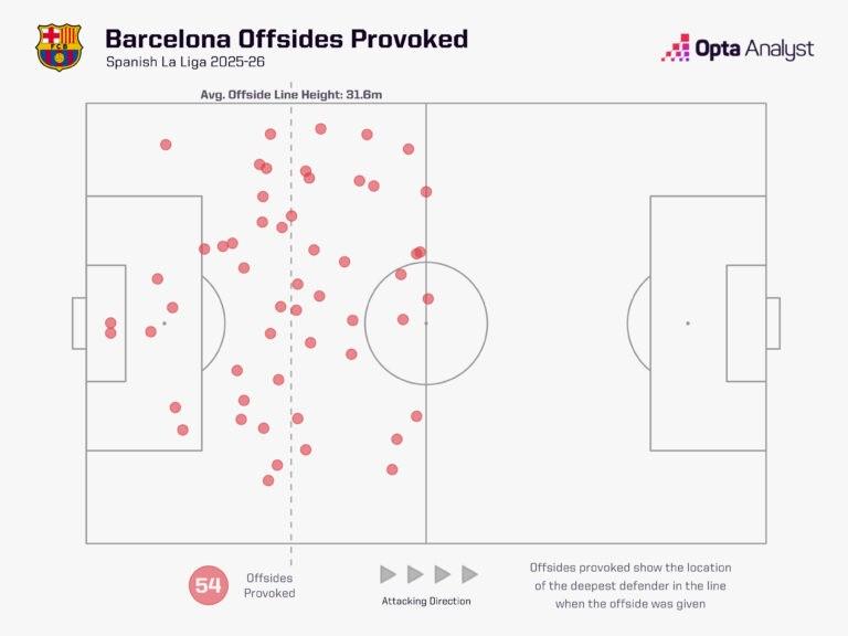本赛季西甲赛场,巴萨制造越位的位置平均距离自家球门31.6米,相比2024-25赛季的33.8米略向内收。上赛季,这一平均距离比西甲其他所有球队都远出2米,位居联赛第一;而本赛季,他们在这一数据上落后于皇马(34.6米)和马竞(32.6米),但制造的越位次数却分别比这两支球队多了46次和44次。