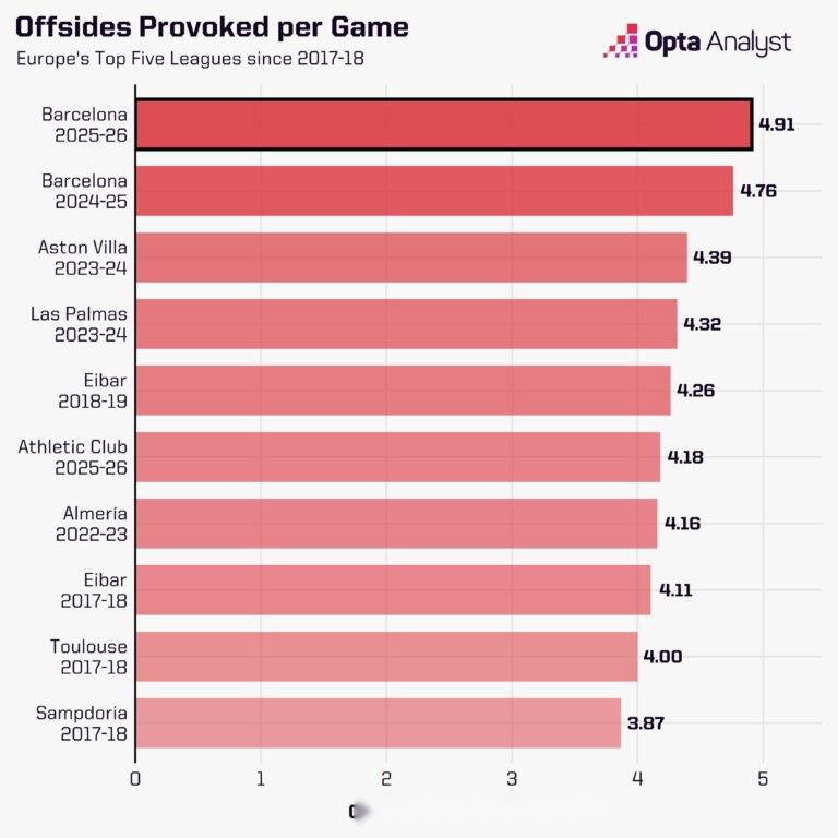 但这并不意味着巴萨如今在制造对手越位方面完全失效。本赛季至今,他们无论是累计制造越位次数(54次)还是场均制造越位次数(4.91次)都位居欧洲五大联赛首位。