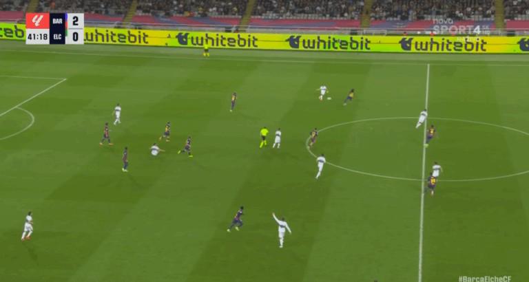 而就在上周末,埃尔切球员拉法-米尔从中场线一路奔袭,突破巴萨的越位陷阱后推射破门。