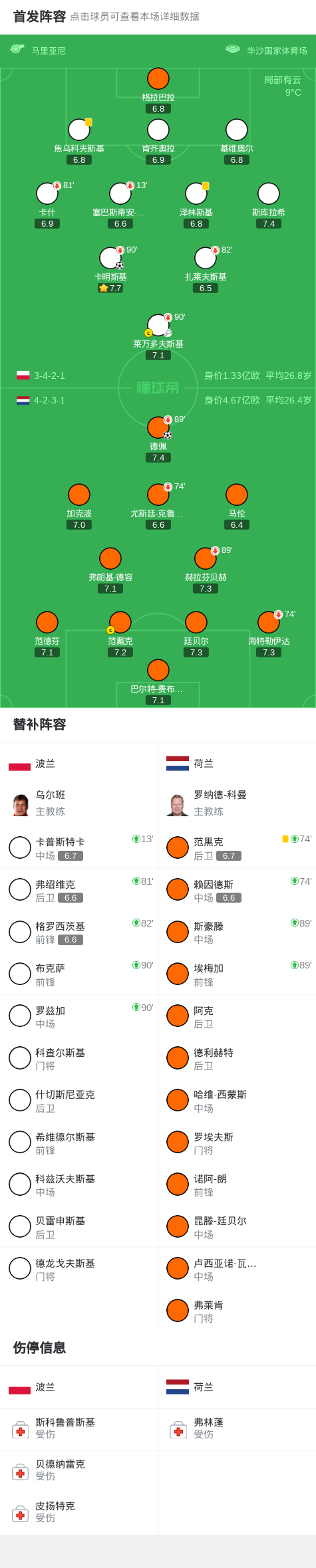荷兰客场1-1波兰,德佩、卡明斯基破门,莱万送助攻