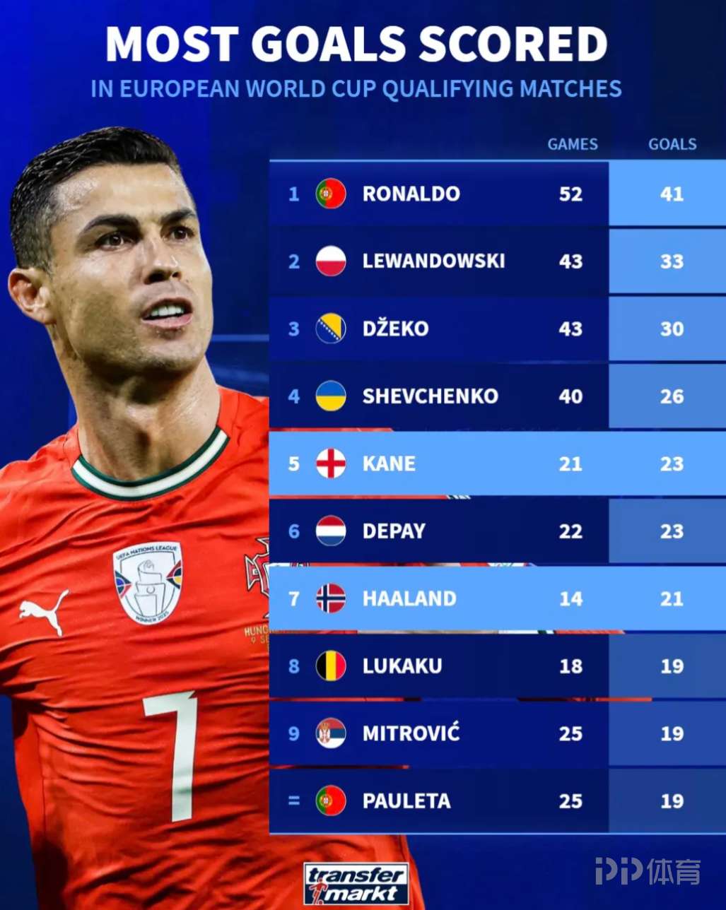欧预赛历史射手榜:C罗52场41球居首;莱万和哲科排名二三位