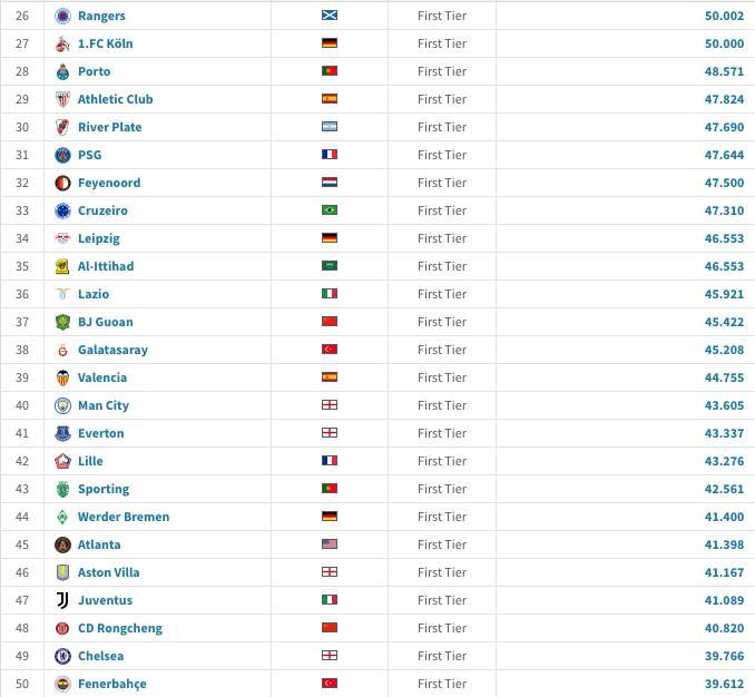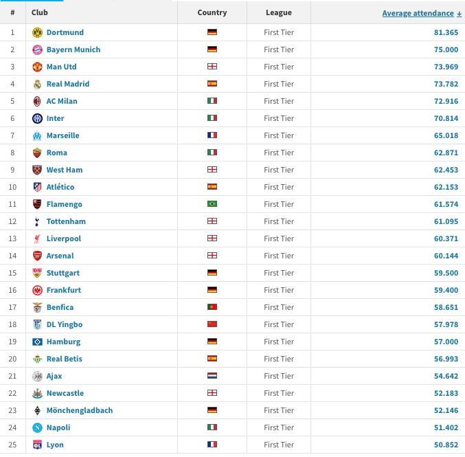 德转本赛季全球主场场均上座TOP25:多特拜仁前二,英博第18