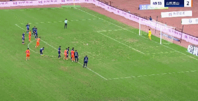 第45+3分钟,刘洋禁区后点推射破门,山东2-0三镇